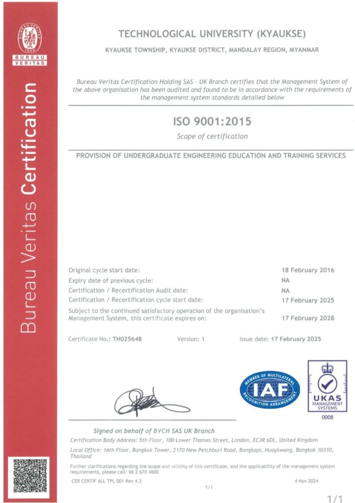 TECHNOLOGICAL UNIVERSITY (KYAUKSE) – ISO9K – UKAS October 22, 2025 Category: News & Events Leave a comment ISO 9001 : 2015