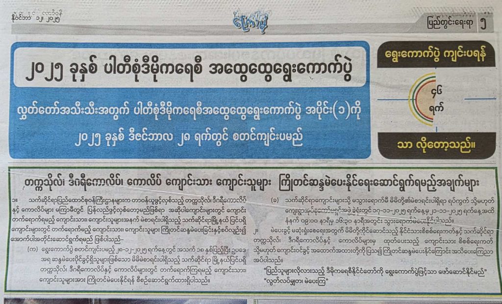 တက္ကသိုလ်၊ ဒီဂရီကောလိပ်၊ ကောလိပ် ကျောင်းသား၊ ကျောင်းသူများ ကြိုတင်ဆန္ဒမဲပေးနိုင်ရေးဆောင်ရွက်ရမည့်အချက်များ November 15, 2025 Category: News & Events Leave a comment