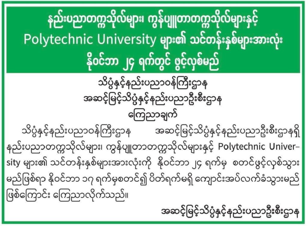 နည်းပညာတက္ကသိုလ်များ၊ ကွန်ပျူတာတက္ကသိုလ်များနှင့် Polytechnic University များ၏ သင်တန်းနှစ်များအားလုံး နိုဝင်ဘာ ၂၄ ရက်တွင် ဖွင့်လှစ်မည် November 15, 2025 Category: Activities, News & Events Leave a comment