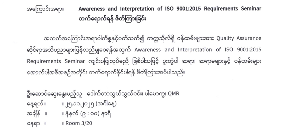Awareness and Interpretation of ISO 9001:2015 Requirements Seminar November 21, 2025 Category: News & Events Leave a comment