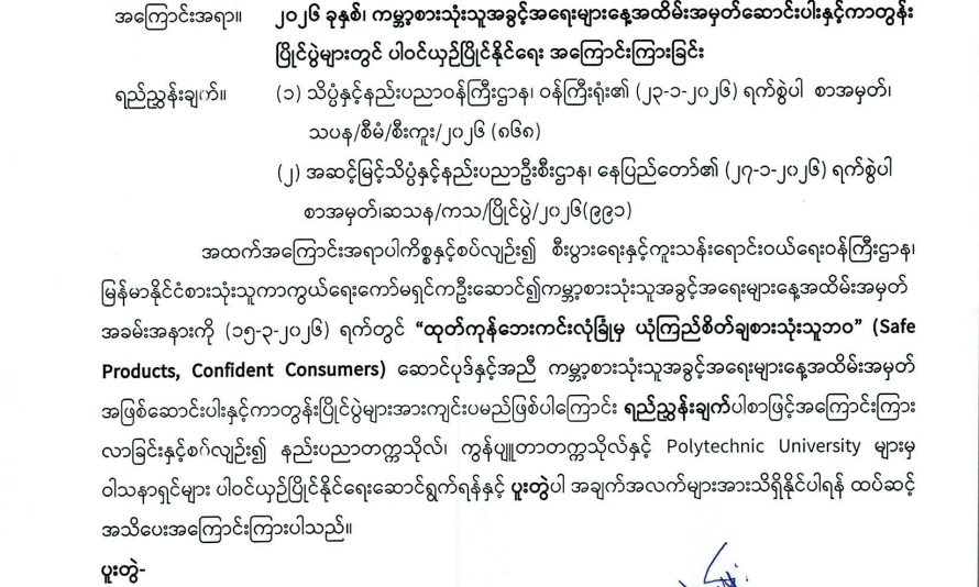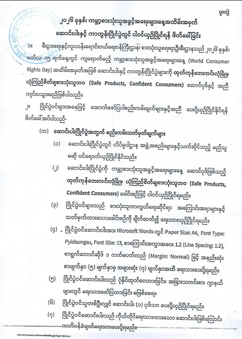 ၂၀၂၆ ခုနှစ်၊ ကမ္ဘာ့စားသုံးသူအခွင့်အရေးများနေ့ အထိမ်းအမှတ် ဆောင်းပါးနှင့်ကာတွန်းပြိုင်ပွဲများတွင် ပါဝင်ယှဉ်ပြိုင်နိုင်ရေး အကြောင်းကြားခြင်း